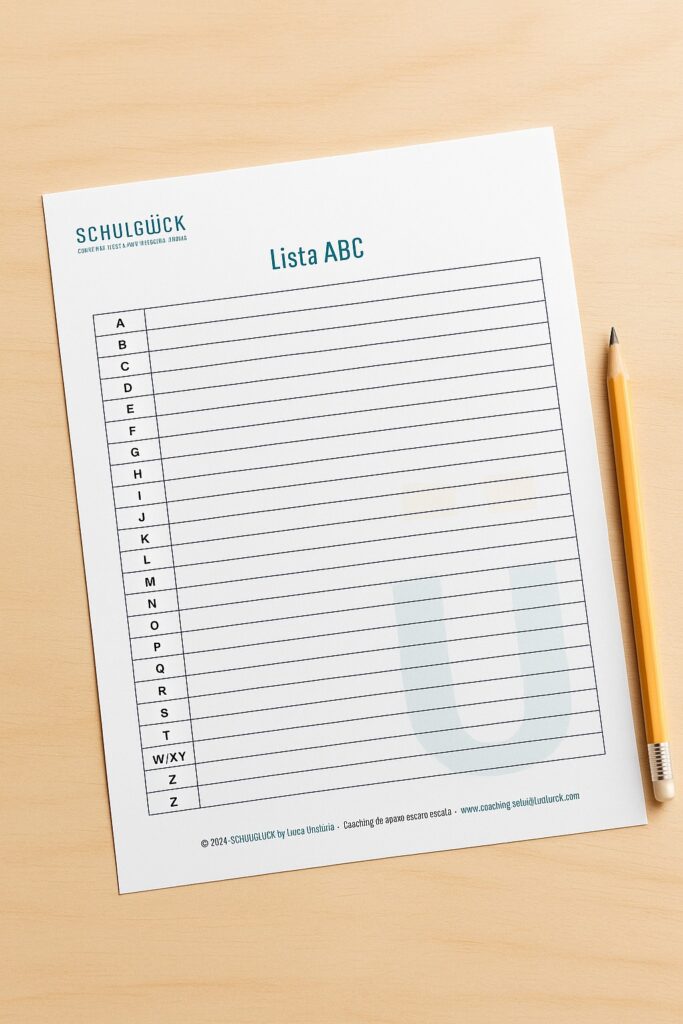 Plantilla de Lista ABC de Schulglück: una herramienta visual sencilla para activar el conocimiento previo antes de estudiar.